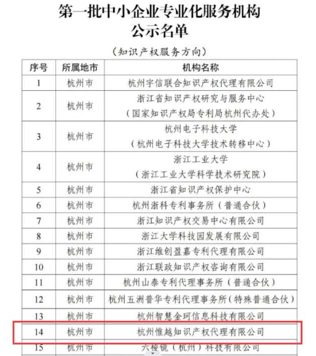 • 喜報!!關(guān)于杭州惟越知識產(chǎn)權(quán)代理有限公司入選浙江省首批中小企業(yè)專業(yè)化服務(wù)機構(gòu)的公示